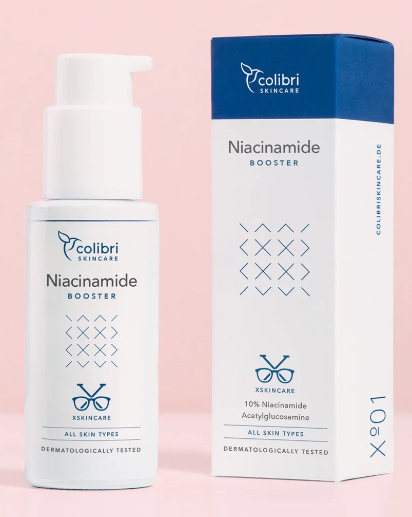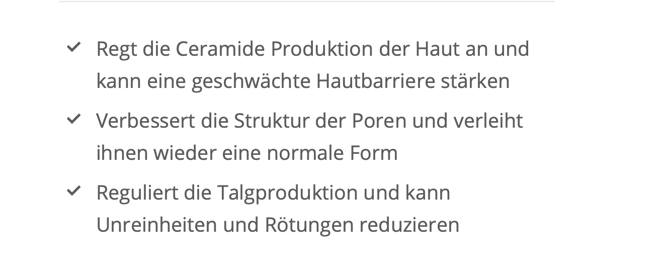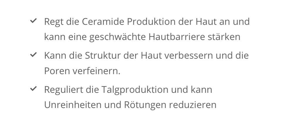 2 Sie schreiben außerdem, “Regt die Ceramide Produktion der Haut an und kann eine geschwächte Hautbarriere stärken”, “Reguliert die Talgproduktion und kann Unreinheiten und Rötungen reduzieren” und “Der Niacinamide Booster stabilisiert die Schutzbarriere der Haut.”