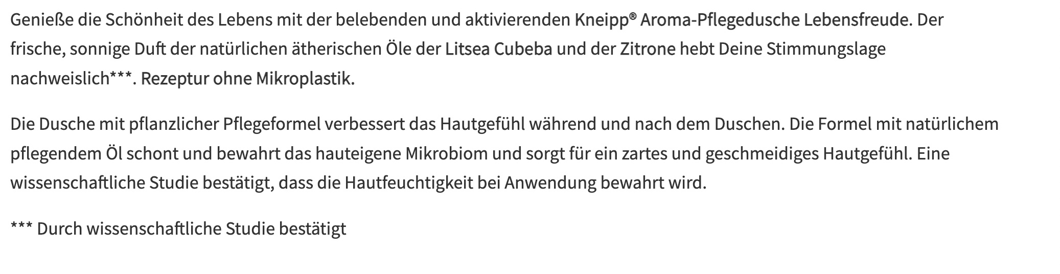 Auf Ihrer Webseite schreiben Sie, das Produkt “Hebt die Stimmungslage nachweislich” und verweisen darauf, dass dies durch “Durch wissenschaftliche Studie bestätigt” worden sei (https://www.kneipp.com/de_de/aroma-pflegedusche-lebensfreude-911004.html).