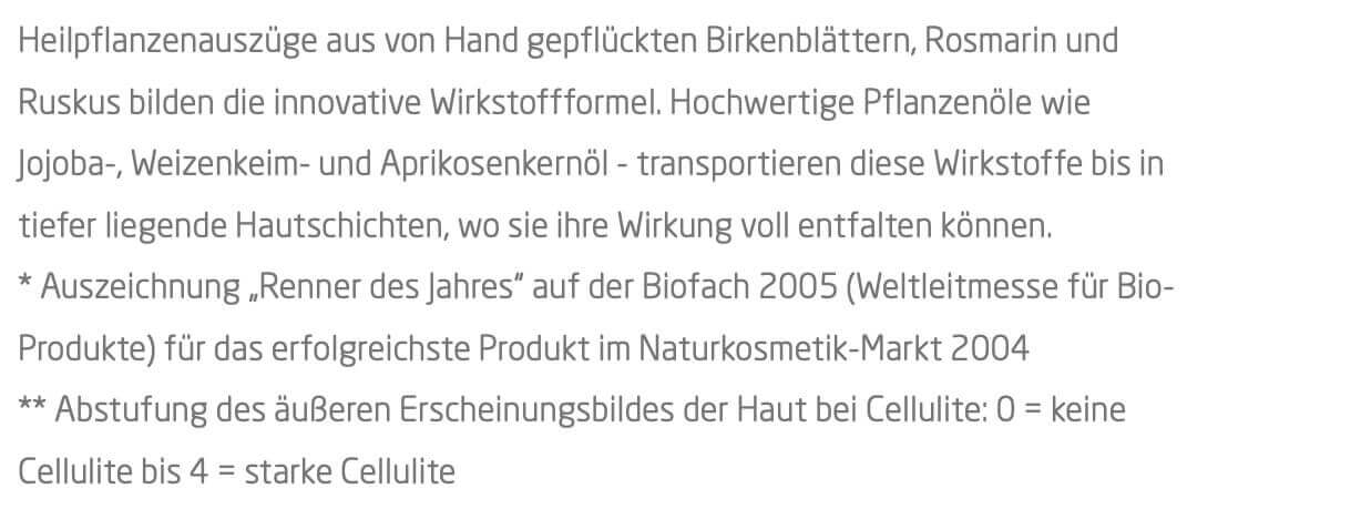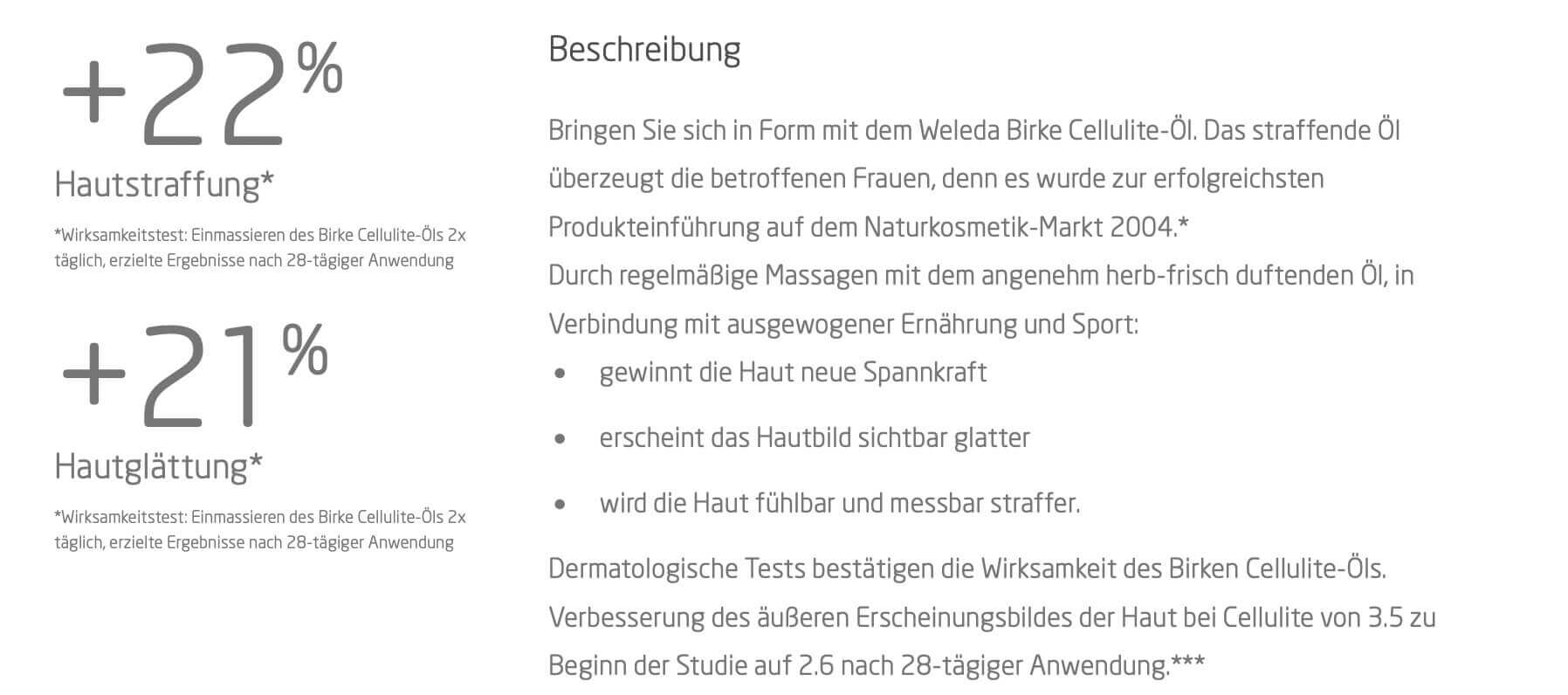 gestoßen https://www.weleda.de/produkt/b/birken-cellulite-oel. Da Sie auf Ihrer Webseite dazu schreiben, dass dermatologische Tests die Wirksamkeit des Öls bestätigt haben, würden wir gerne genaueres zu den Tests erfahren.